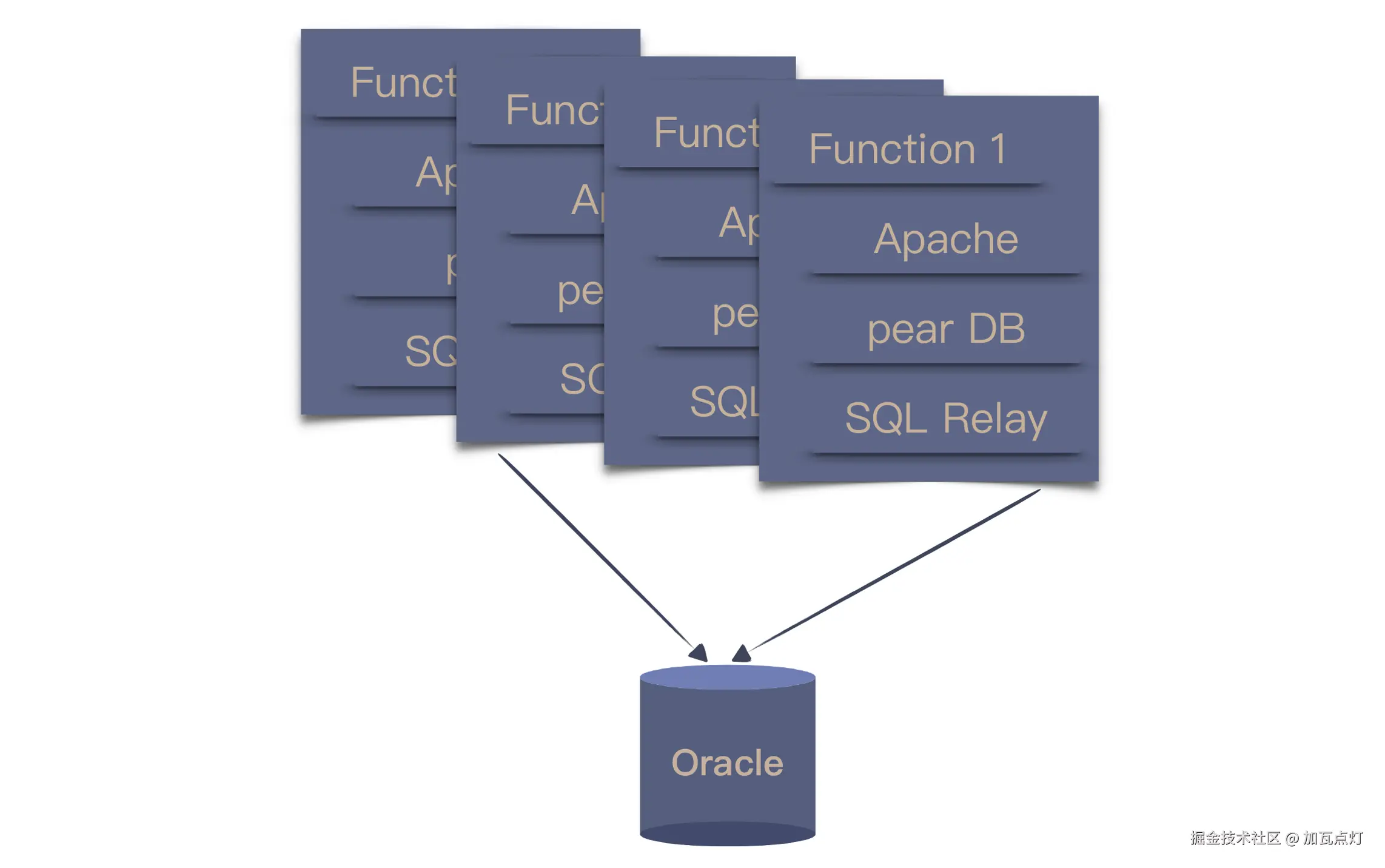 2003年底,团队将 MySQL 换成了 Oracle。由于 Oracle 的性能要好上许多,主从的数据库架构又改回了单一数据库。但由于 PHP 访问数据库的缺省方案没有连接池,只好找了开源的 SQL Relay,这也为后续的改进埋下了伏笔。