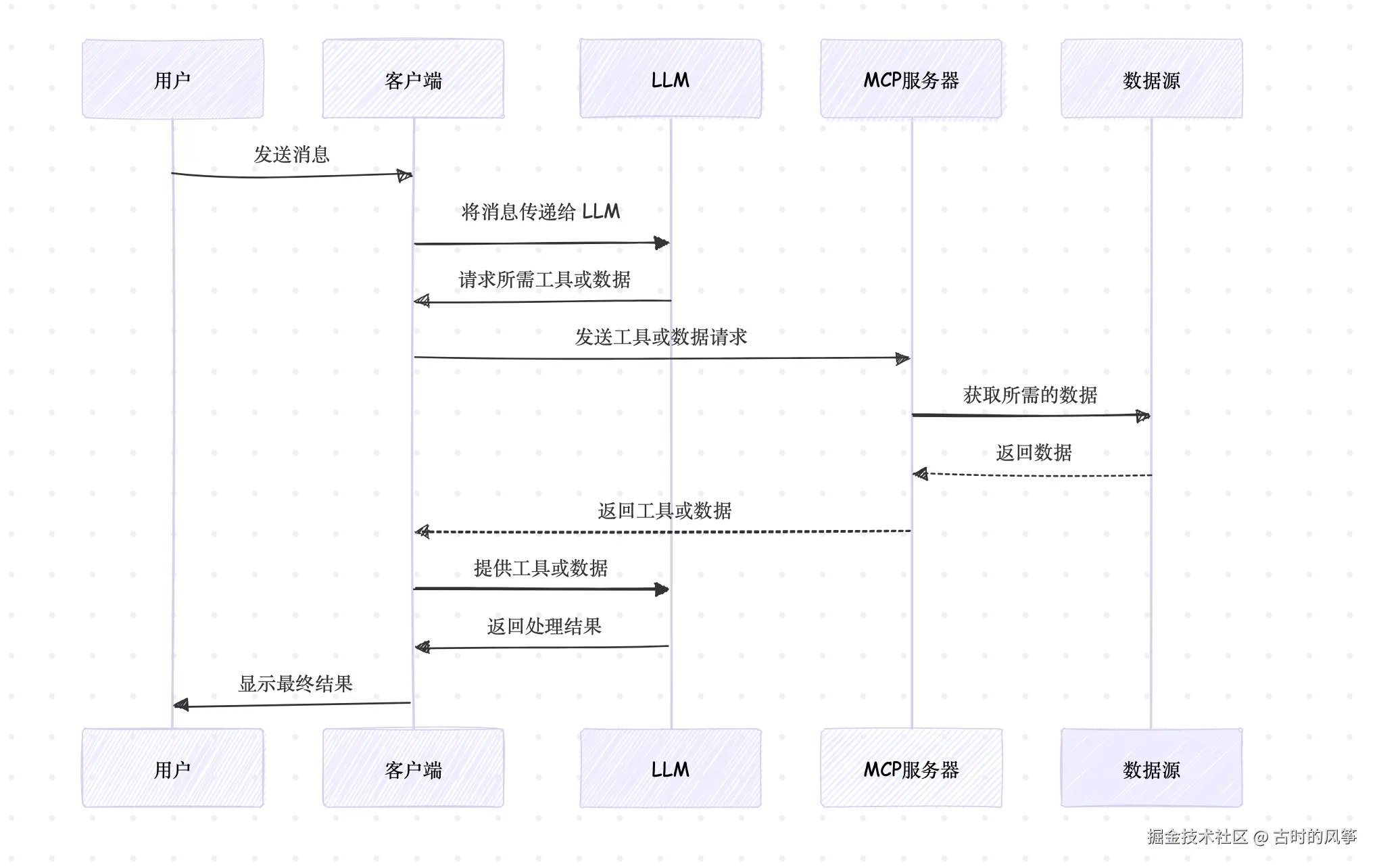 - LLM 返回处理结果:LLM 使用提供的工具或数据生成处理结果,并返回给客户端。