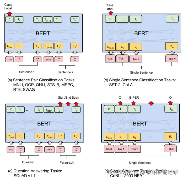 下图是如何对BERT模型进行微调(Fine-tuning)的示例。微调是指在预训练模型基础上,针对特定任务进行额外的训练,以提高模型在该任务上的表现。以下是对每个任务类别的详细解释: