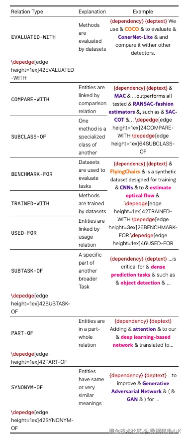 DATASET、METHOD 和 TASK 实体的语义关系类型。