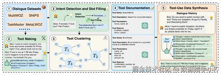 数据集的构建涉及五个主要步骤:收集任务导向的对话数据集、创建工具、基于相似性聚类工具、使用GPT-4生成工具文档,以及合成包含思考、行动(工具调用)、行动输入、观察和调整后响应的工具使用样本。
