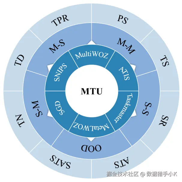 从内到外的圆圈分别代表数据源、MTU-Struct 中包含的场景以及 MTU-Eval 中的自动评估指标。