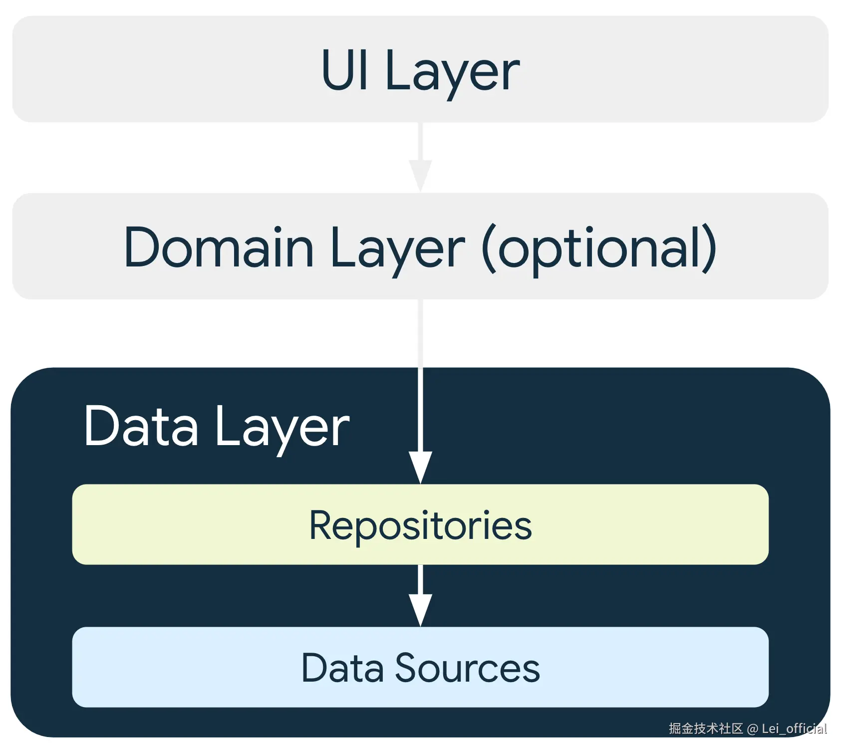 数据层由多个仓库组成,其中每个仓库都可以包含零到多个数据源。应该为应用中处理的每种不同类型的数据分别创建一个数据仓库(Repository)类。例如,可以为与电影相关的数据创建一个 MoviesRepository 类,或者为与付款相关的数据创建一个 PaymentsRepository 类。