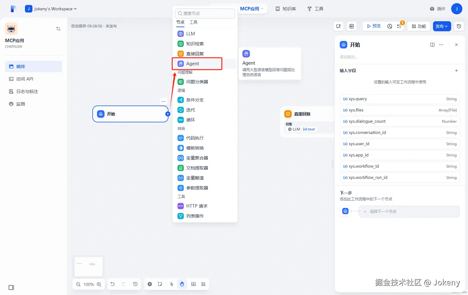 移除应用中的LLM节点,添加Agent节点,如下图: