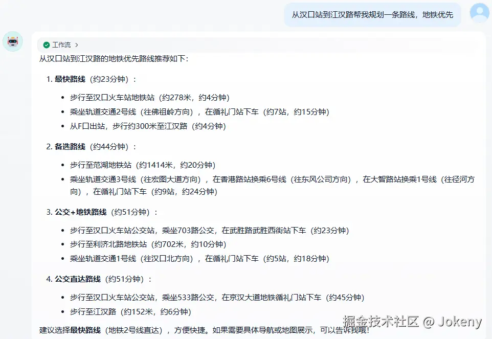 输入“从汉口站到江汉路帮我规划一条路线,地铁优先”,Dify会调用高德地图的公交路径规划接口,返回详细的路线信息。