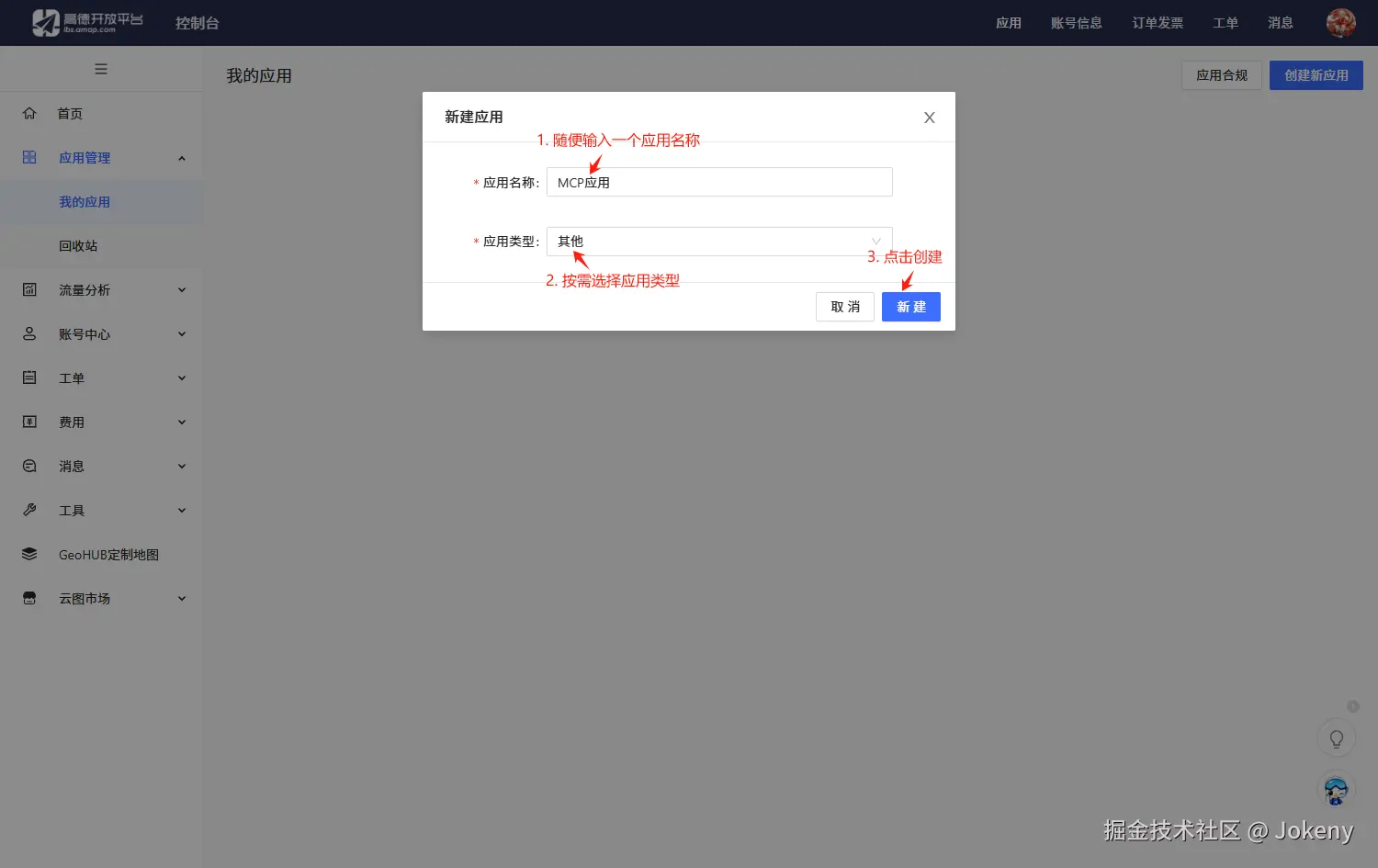 在控制台中选择应用管理->我的应用,点击创建新应用