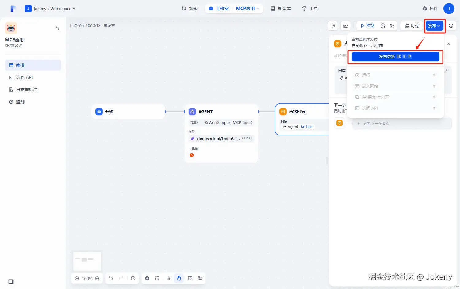 AGENT策略:选择我们刚刚安装的策略插件,选择ReAct(Support MCP Tools)