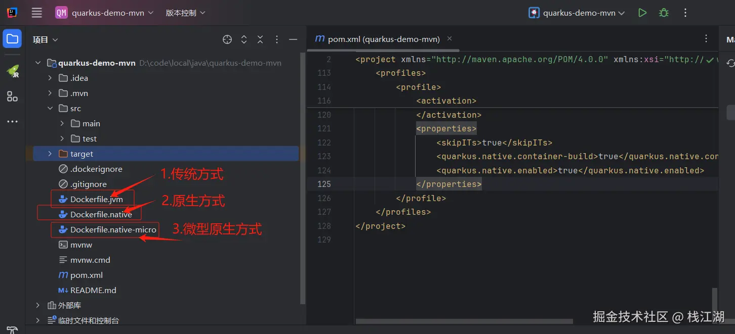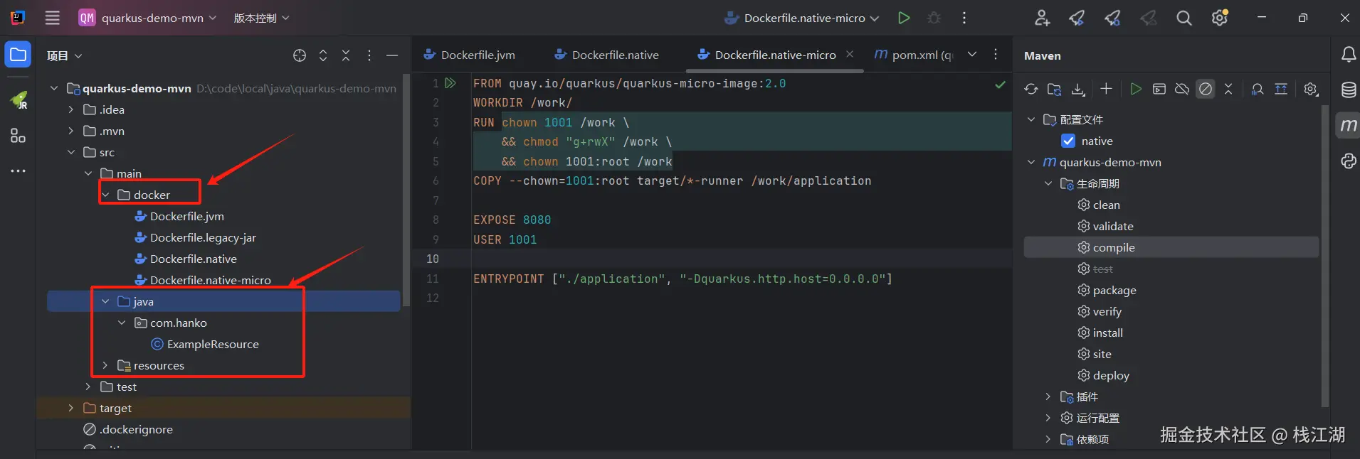 Dockerfile.jvm适合传统的 Java 应用,兼容性好,构建速度快。Dockerfile.native适合云原生场景,启动速度快,内存占用低。Dockerfile.native-micro在Dockerfile.native的基础上进一步优化了镜像大小和安全性,适合对容器化部署有更高要求的场景。
