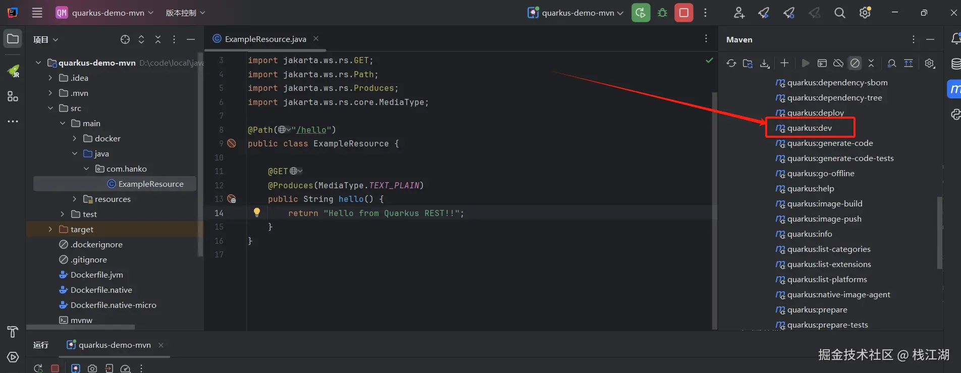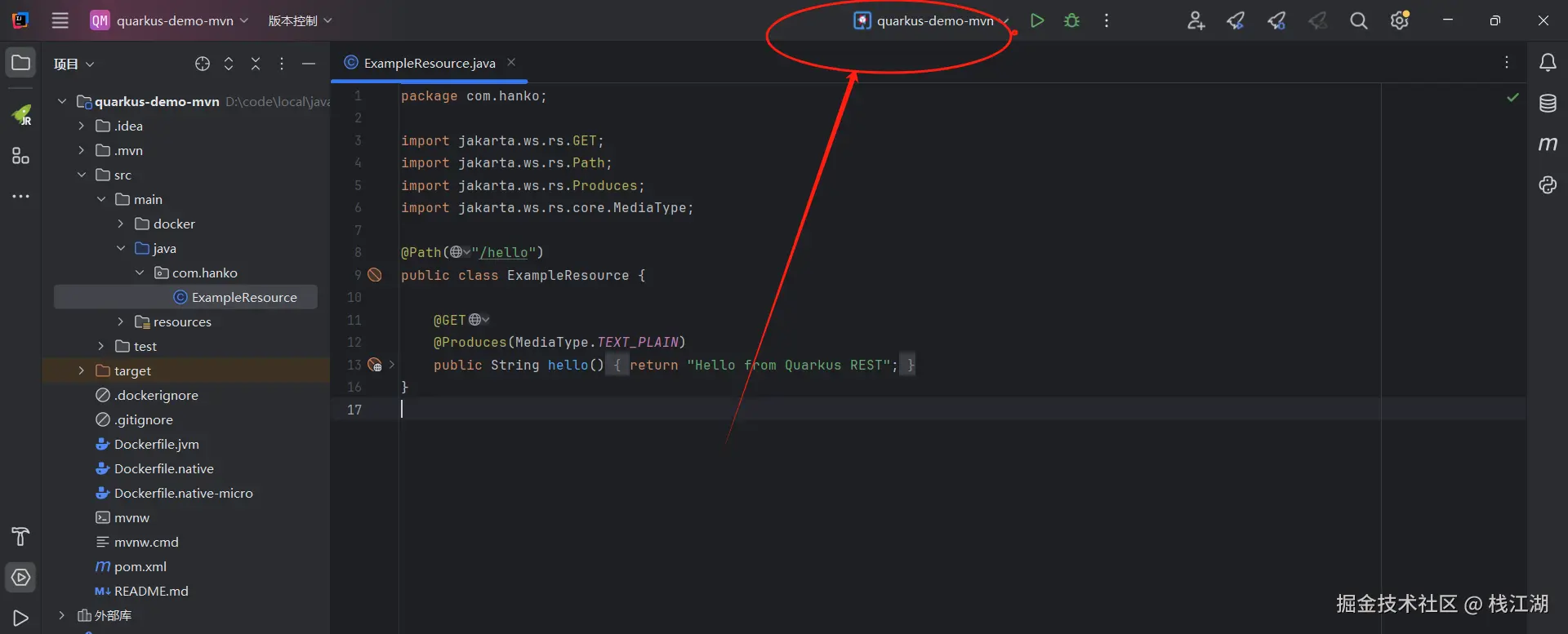 - 一般 IDEA 创建的项目在 IDEA 最上面会有 quarkus logo 点击小三角就可以启动项目。