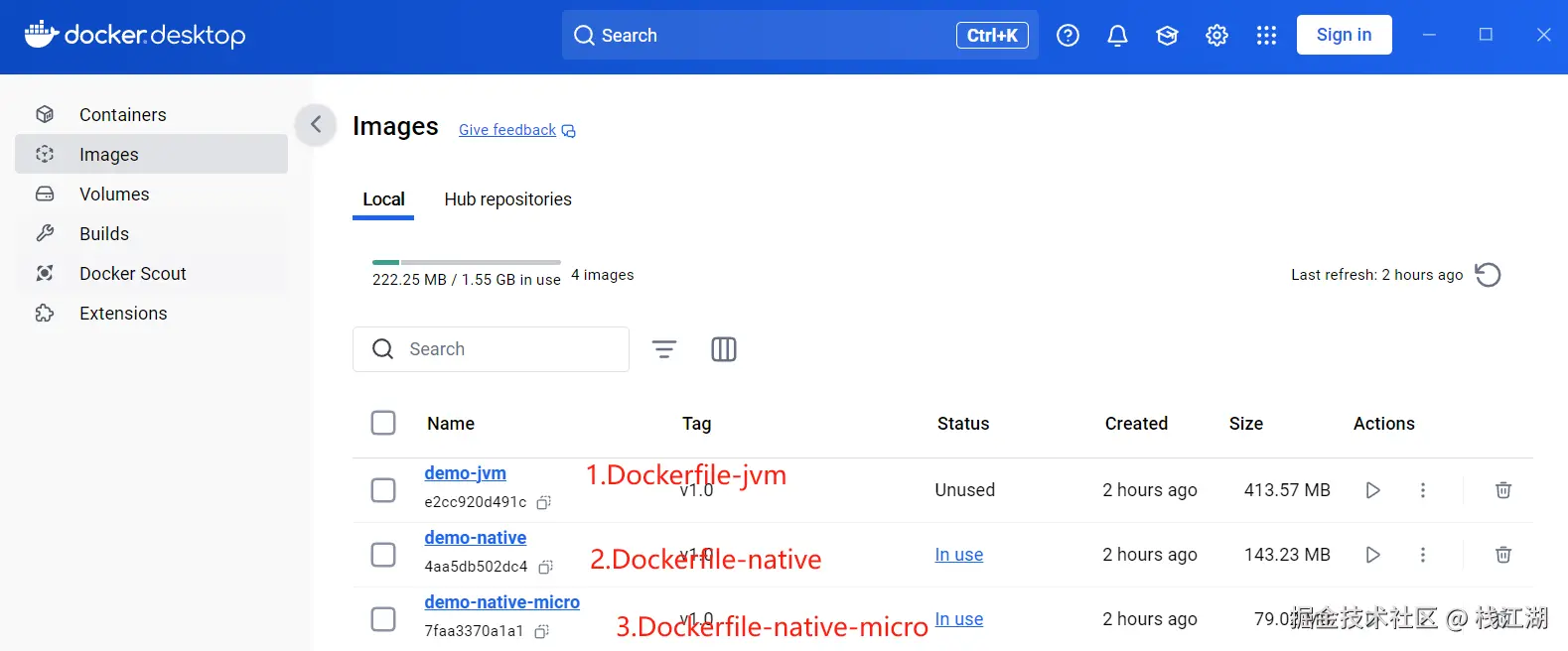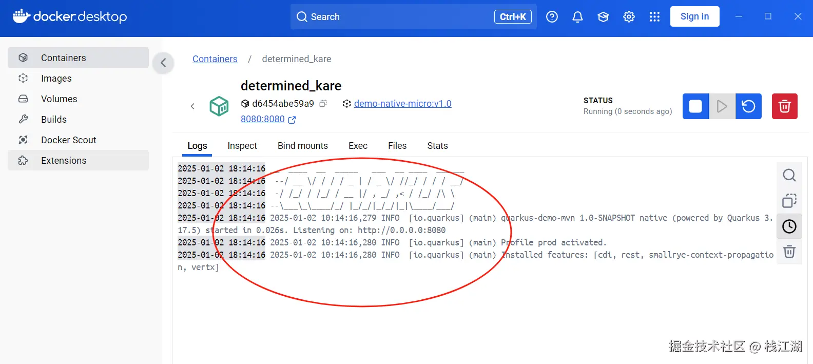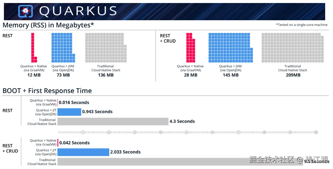 可以看到传统的大小为 413M,而原生的可以达到 79M,缩小 5 倍多。之前很多人抱怨 springboot 太大,打成 docker 就更大了,这回 quarkus 成为你们的福音了。
