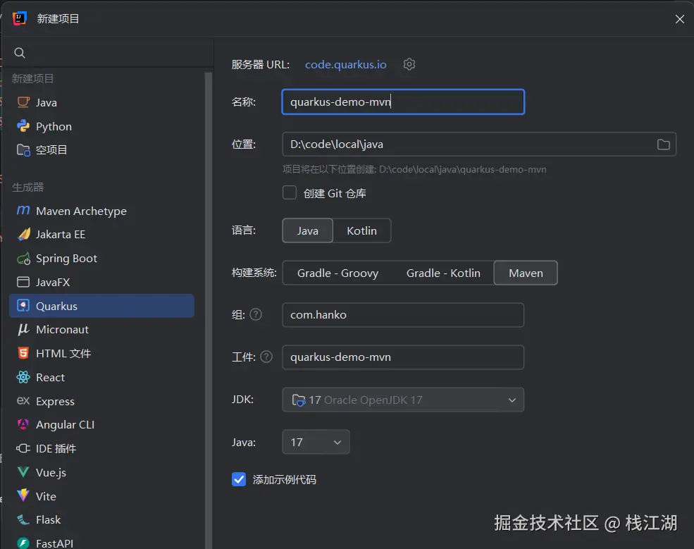 - 选择“Quarkus”作为项目类型,点击“Next”。