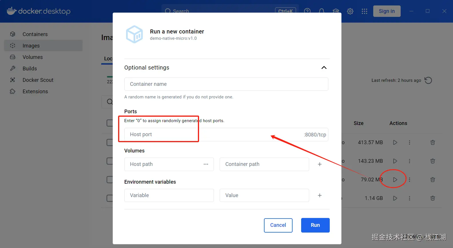 我们再来启动 demo-native-micro 镜像试试,点击小三角后,展开设置界面设置个宿主机的端口