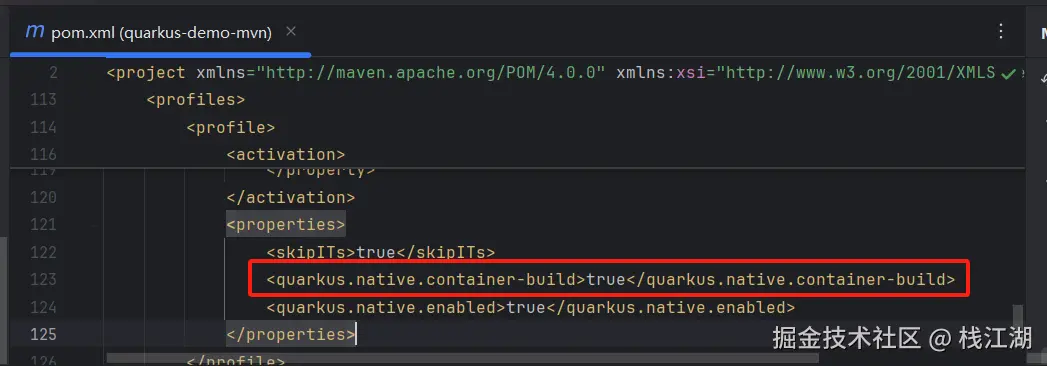 至于-Dquarkus.container-image.build=true 这个参数就可以放到项目中的 pom.xml 中去
