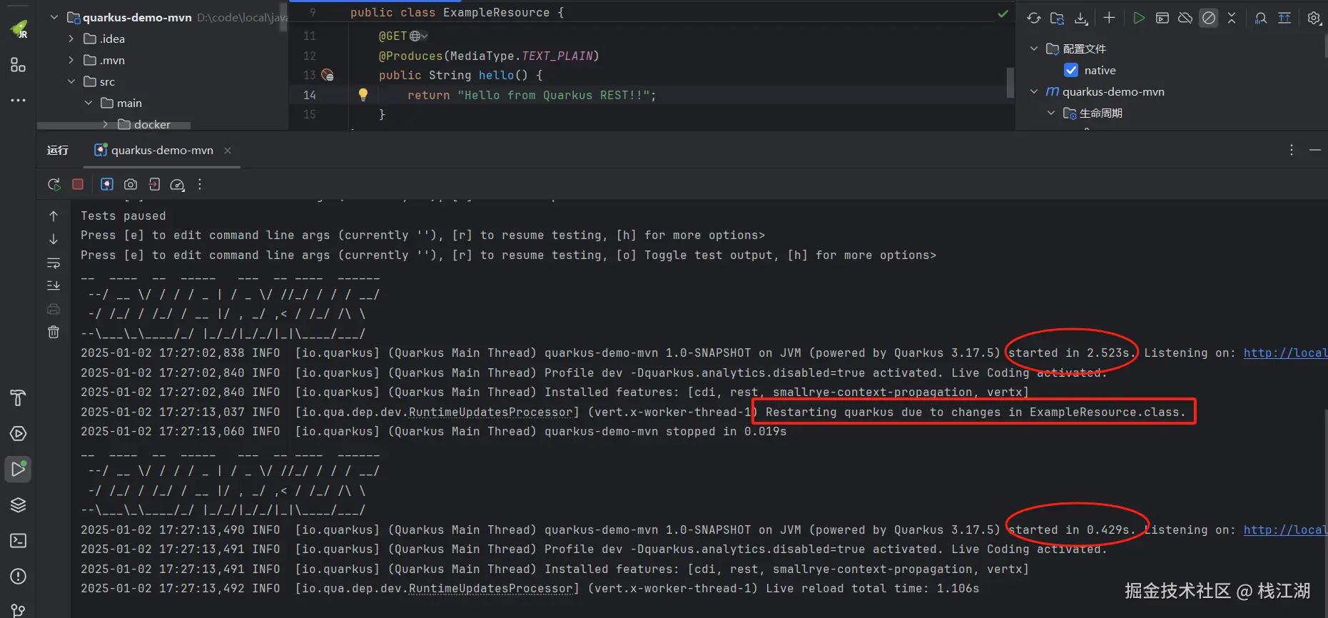 p.s. quarkus 项目还有个比较优秀的功能就是默认就支持热加载,我们修改代码后不需要像 springboot 项目一样手动重启才生效。