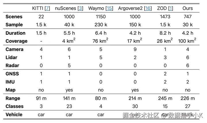 公开可用的自动驾驶感知数据集的比较。覆盖率表示根据 计算的地理覆盖范围,范围是指所有边界框距离 的第 99.9 个百分位数。场景是时间一致的序列,样本是带注释的关键帧,遵循 nuScenes 表示法。Vehicle 是指记录车辆。