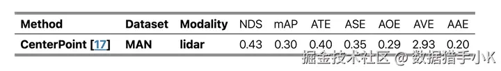 MAN TruckScenes 数据集的测试拆分的基线结果。