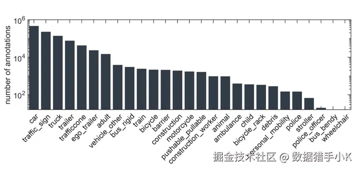 所有数据集拆分中所有 27 个对象类的带注释的 3D 边界框的数量。
