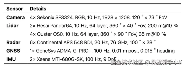 1、传感器组包含4个摄像头、6个激光雷达、6个雷达传感器、2个惯性测量单元(IMU)和高精度全球导航卫星系统(GNSS)的多模态传感器套件。