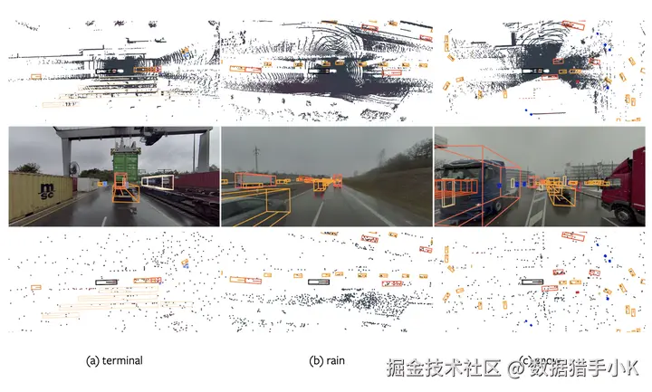 MAN TruckScenes 数据集的终端、雨雪场景的示例选择。顶行显示融合激光雷达点云,中间行显示左前摄像头的图像,底部显示融合雷达点云。