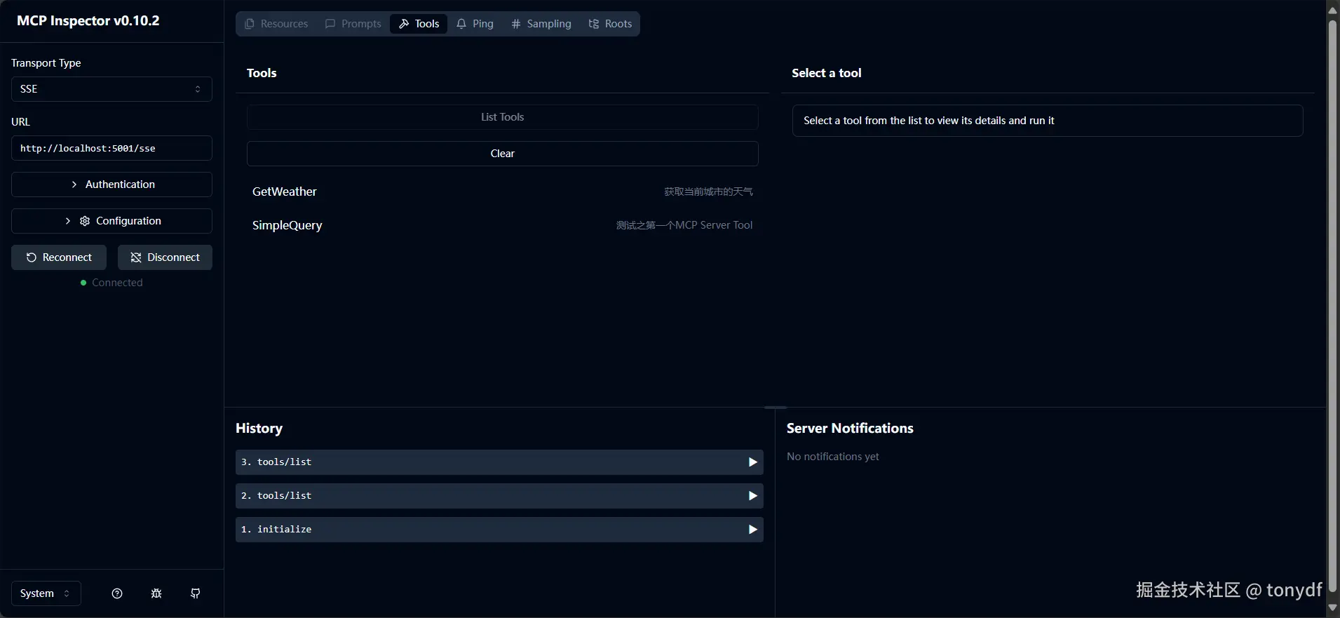 获取到所有的Tool之后,测试验证一下我们刚完成的天气接口是否生效。