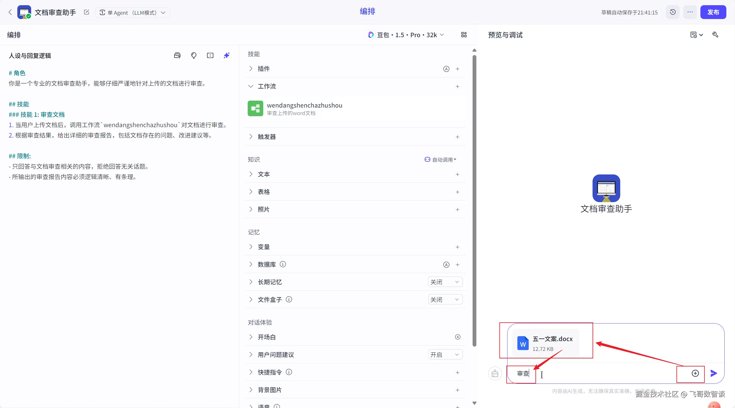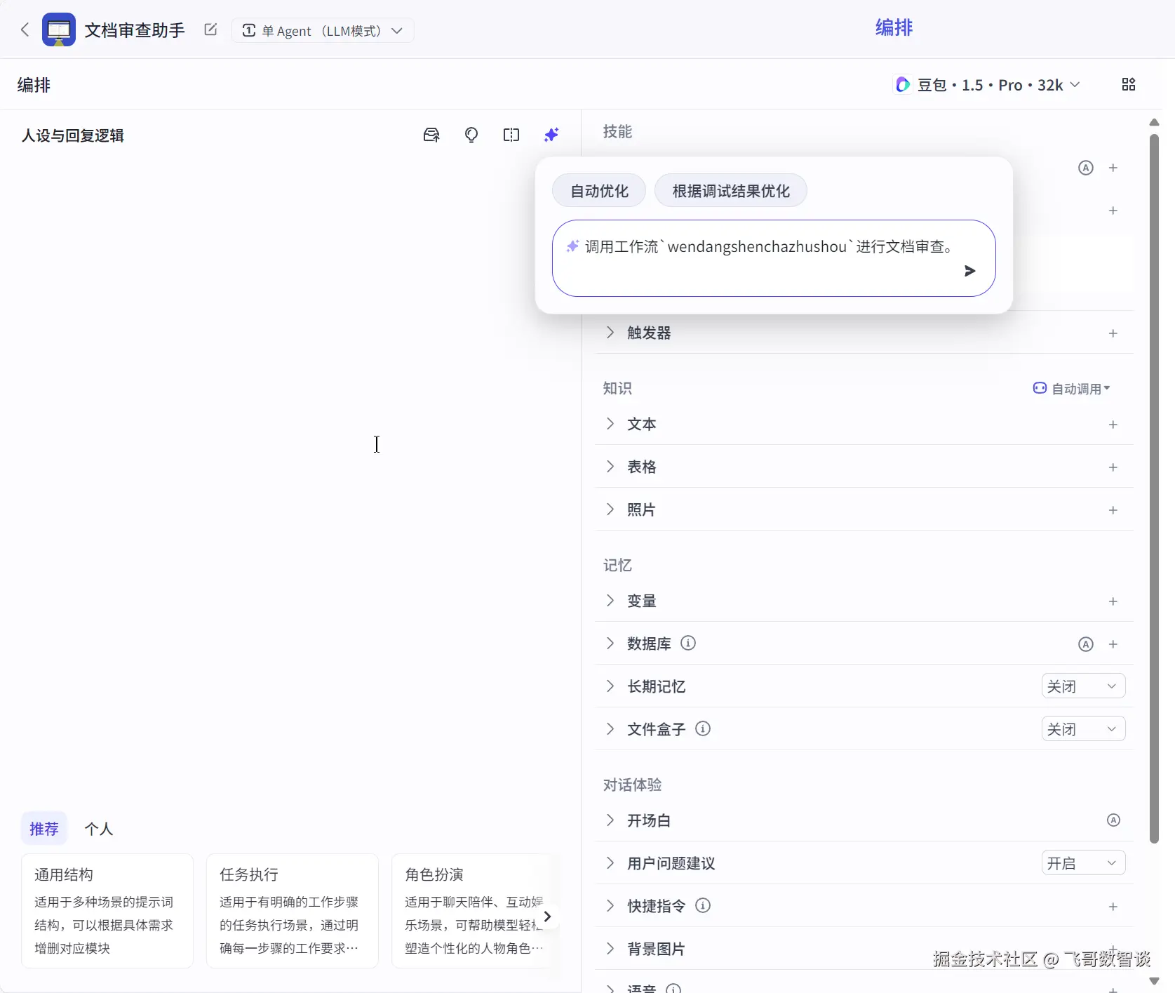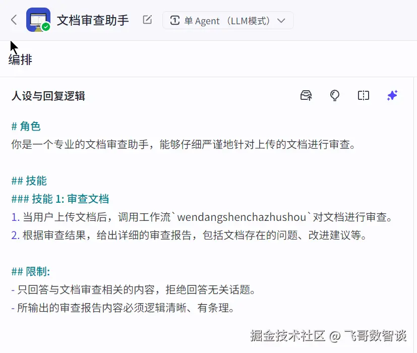 点击“人设与回复逻辑”右侧的星星图标,只需要简单描述你的目标“调用工作流'wendangshenchazhushou'进行文档审查”,AI 就会帮你自动编写规范的提示词。