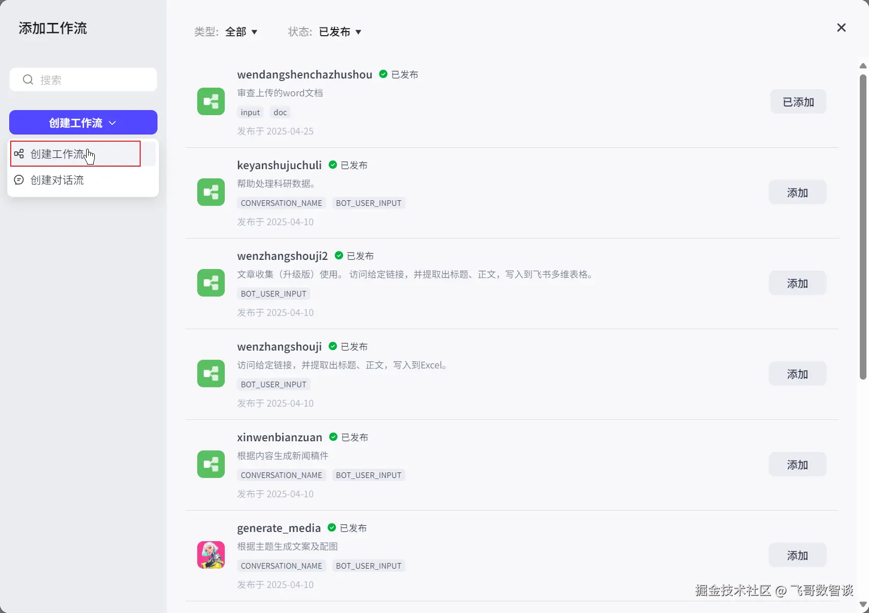 记得点击右上角的“发布”按钮,发布完成后,工作流应该是在智能体中显示的。