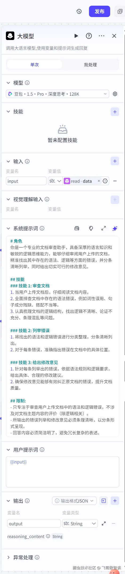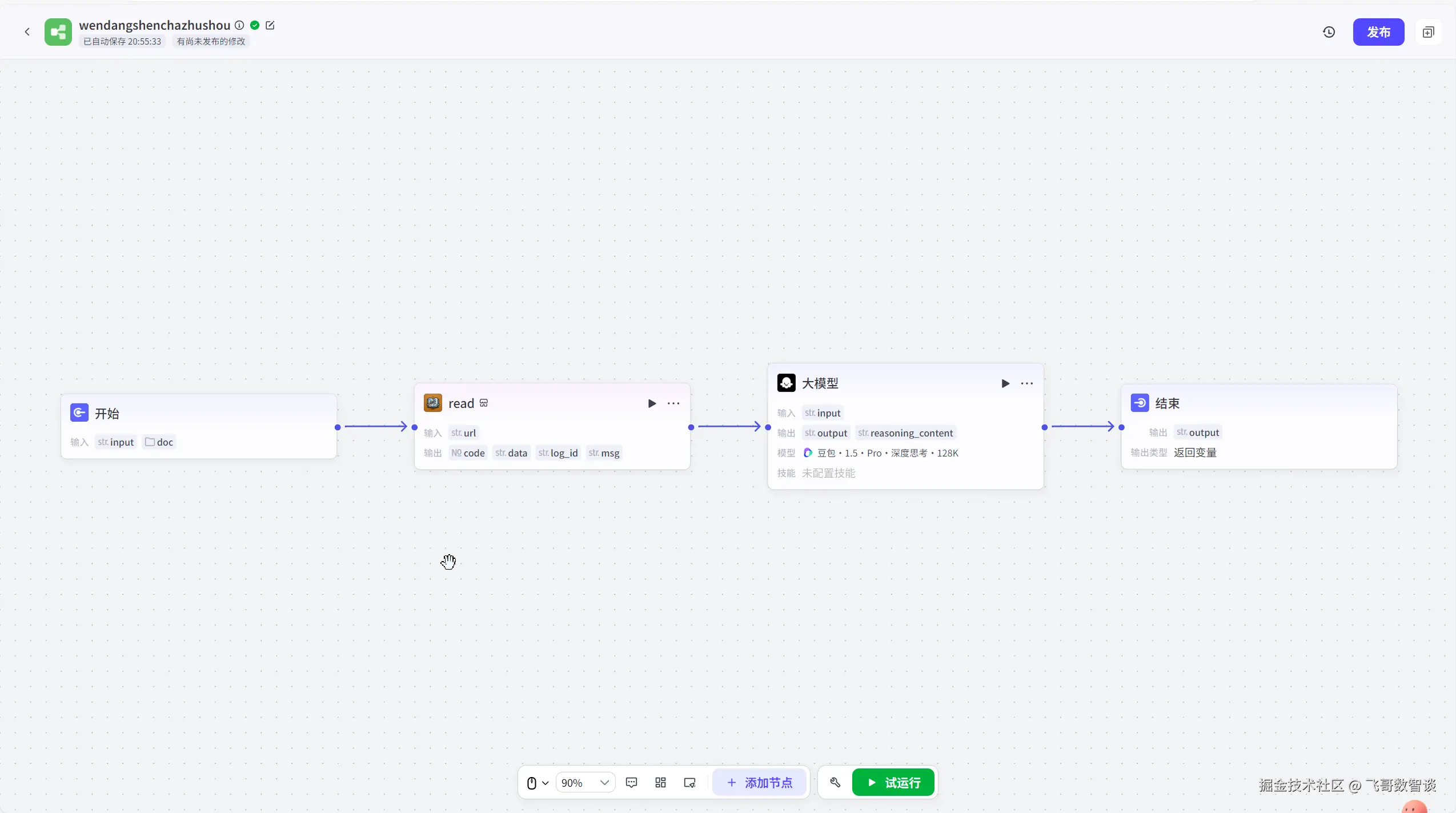 先看下工作流的整体结构:输入->文件读取->大模型审查->输出。