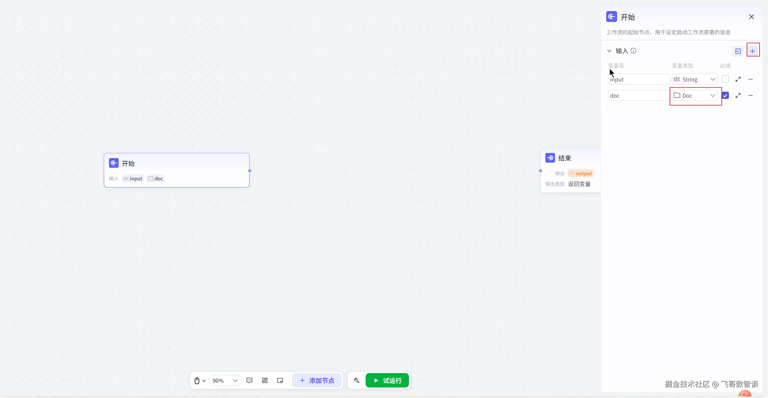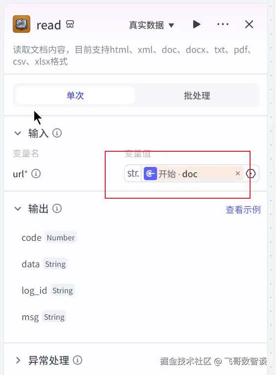 将“开始”节点与“文件读取”节点连接后,设置“文件读取”节点的输入为“开始”节点的 doc。