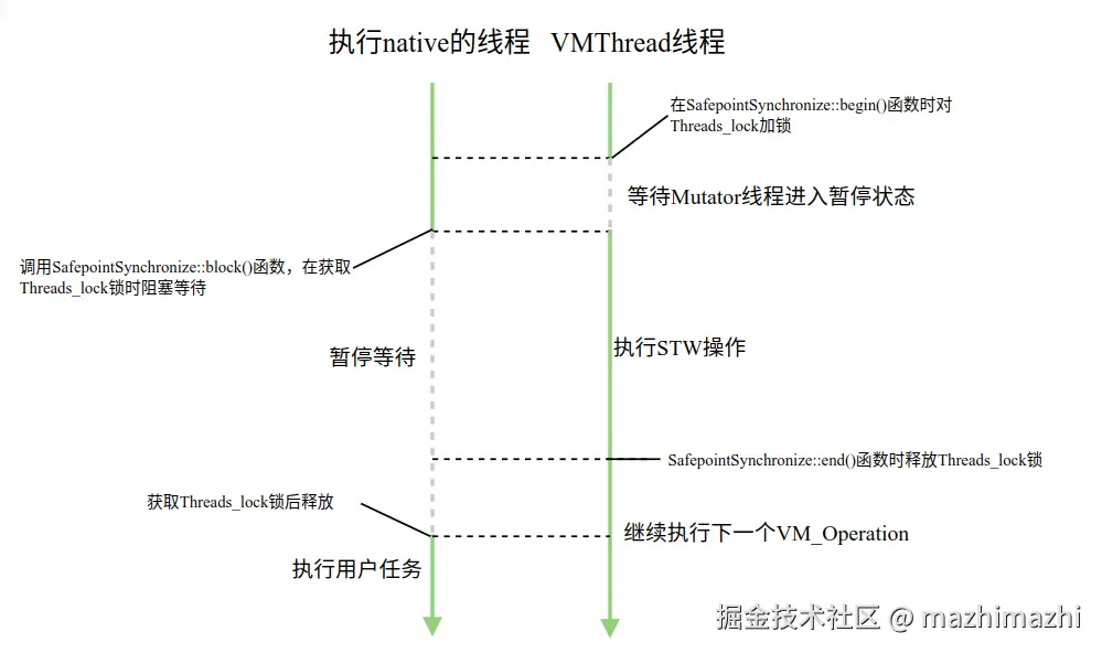 在《深入剖析Java虚拟机HotSpot:源码剖析与实例详解》一书中的 执行本地代码线程进入安全点 一小节详细剖析过代码实现,这里简单给一个交互的图示。