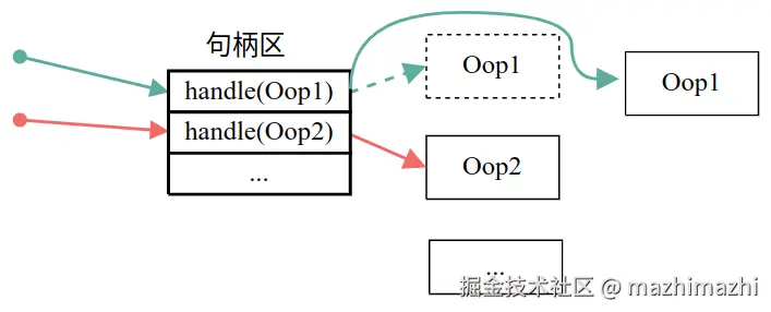 与直接引用比起来,句柄就是一种间接引用,不过将所有引用集中在句柄区就能让GC高效的扫描,native函数通过句柄也能安全操作对象,假设GC将对象Oop1从Eden区移动到了To区,只需要将句柄中封装的引用地址更新为最新地址即可。如下图所示。