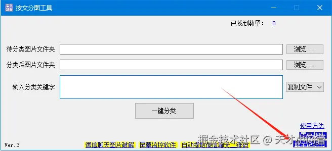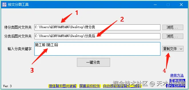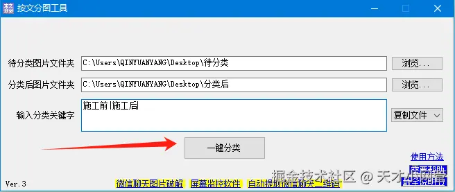 3,软件打开后,有3个格子需要录入,分别是【待分类图片文件夹】、【分类后图片文件夹】、【输入分类关键字】