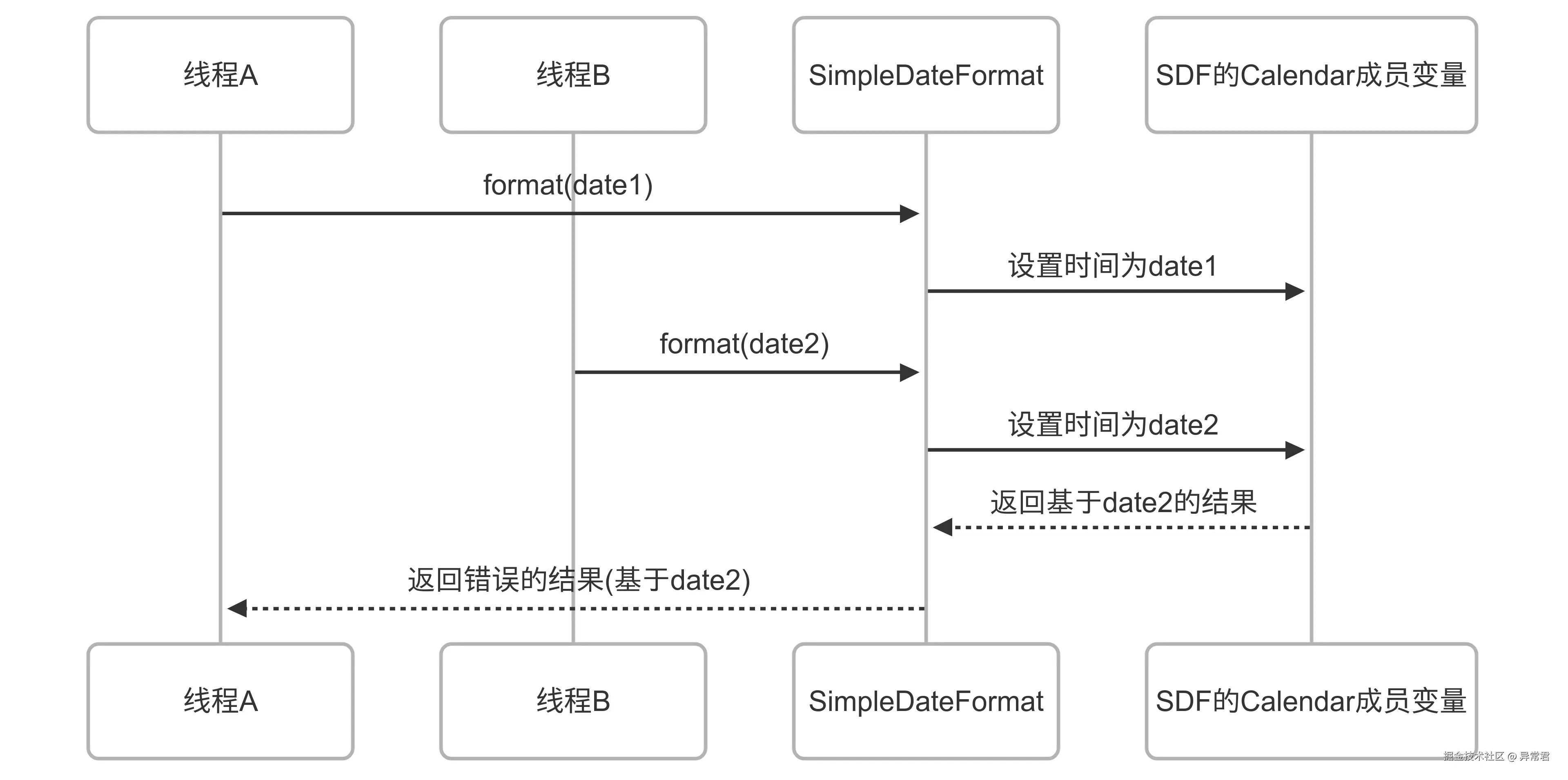 这里的问题在于,线程 A 的格式化操作被线程 B 打断,导致线程 A 最终使用了线程 B 设置的 calendar 状态,产生了错误的结果。
