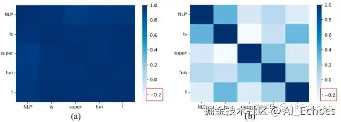 就是余弦相似度,下图给出了训练前后token间的相似度: