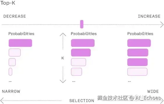 TopK通过对Softmax的输出结果logit中最大的K个token采样来选择输出的token,该方法存在的问题是当概率分布很极端时,即模型很确定下一个token时,容易造成生成错误。以下图为例,TopK采样会选择最大的K个token ,并通过logit值对K个token进行采样,相比于贪心搜索增添了随机性,相当于同样的输入,多次经过TopK采样生成的结果大概率不会一样。