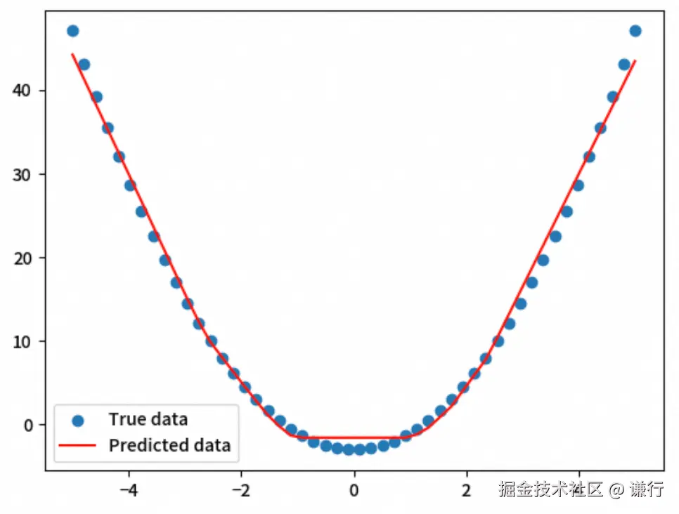 Loss 从第 100 个 Epoch 的 61.71 逐步下降到第 1000 个 Epoch 的 1.22,呈单调递减趋势,说明模型在训练过程中能够有效学习,参数更新方向正确,正在逐步逼近真实函数关系。真实预测结果确实比较吻合