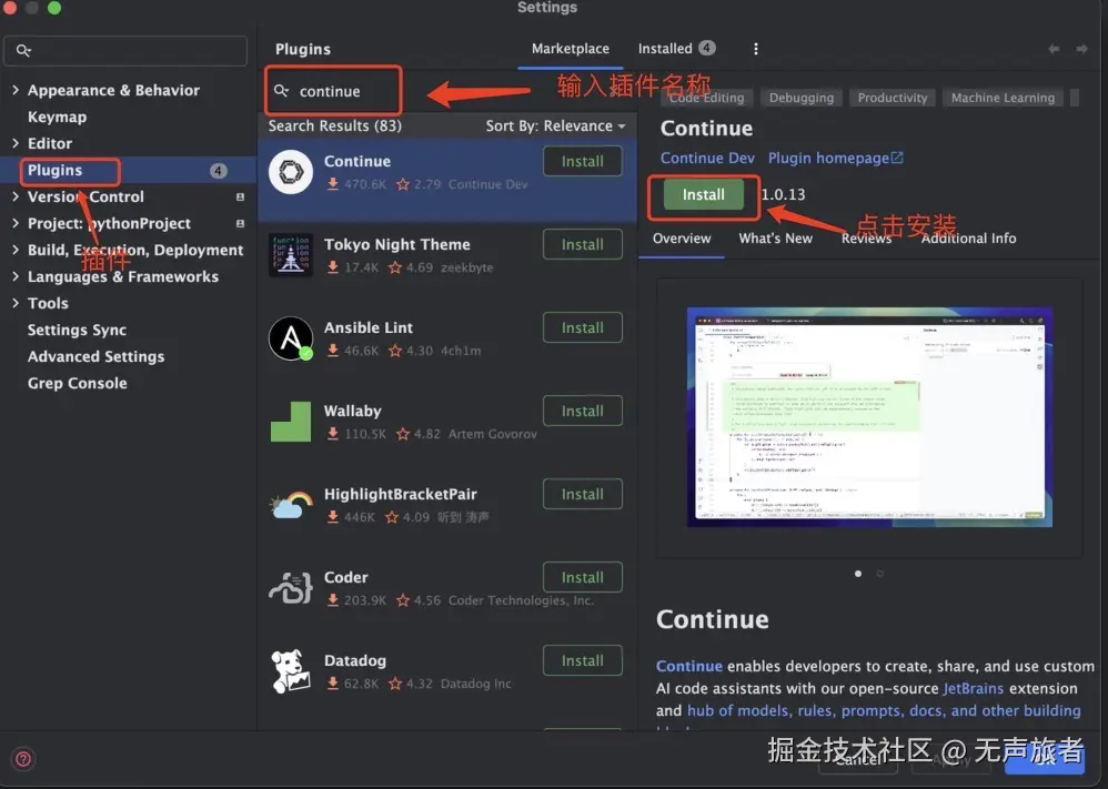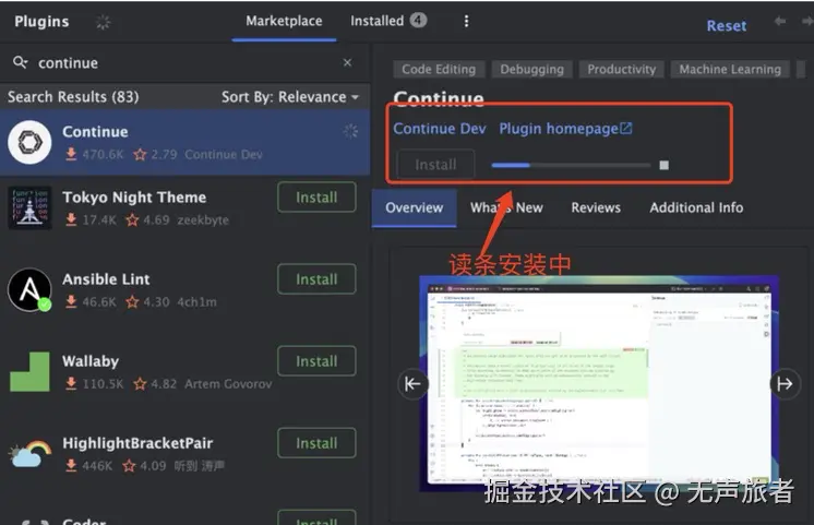 #####4. 点击 “Continue Dev” 插件,然后选择 “Install” 进行安装。安装过程可能需要一些时间,取决于网络速度和电脑性能。安装成功后,PyCharm 界面会出现 Continue 插件的图标。