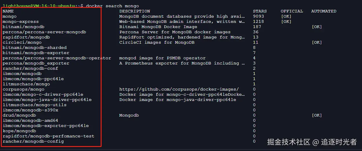 此外,我们还可以用docker search mongo命令来查看可用版本: