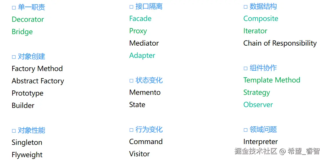 在实际工作中,很少会规定必须使用哪些设计模式,这样只会带来限制和条条框框。不能为了使用设计模式而去做架构,而是有了做架构的需求后,发现它符合某一类设计模式的结构,再将两者结合。设计模式从来都不是单个设计模式独立使用的。在实际应用中,通常多个设计模式混合使用,你中有我,我中有你。设计模式要活学活用,不要生搬硬套。死记硬背是没用的,还要从实践中理解。想要游刃有余地使用设计模式,需要打下牢固的程序设计语言基础,夯实自己的编程思想,积累大量的时间经验,提高开发能力。