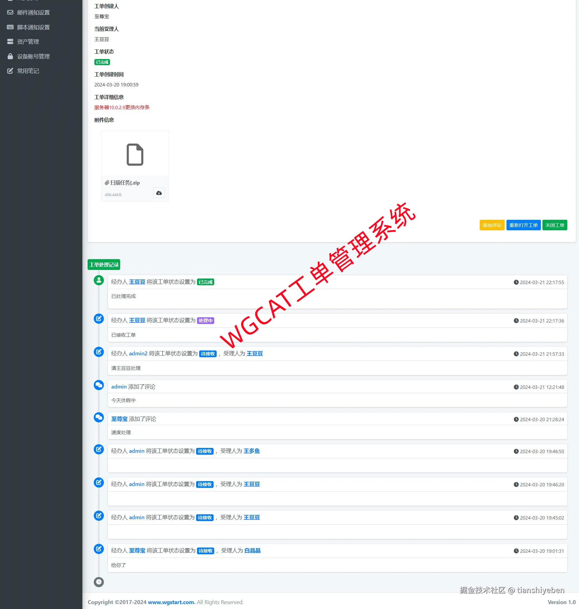 WGCAT目前也没有流程设计的模块,任何成员都可以提交工单、评论工单、处理自己的工单,可以将自己的工单指派给其他人,非常灵活自由