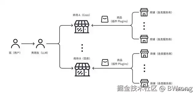 小店们觉得这事不错,便遵守平台一定的上架规范,开始把他们的商品(Tool)变成了插件(Plugin),我(User)提的好多需求,男朋友(LLM)在这些平台上就能一站式满足了,选几个插件直接用就行,方便了挺多。