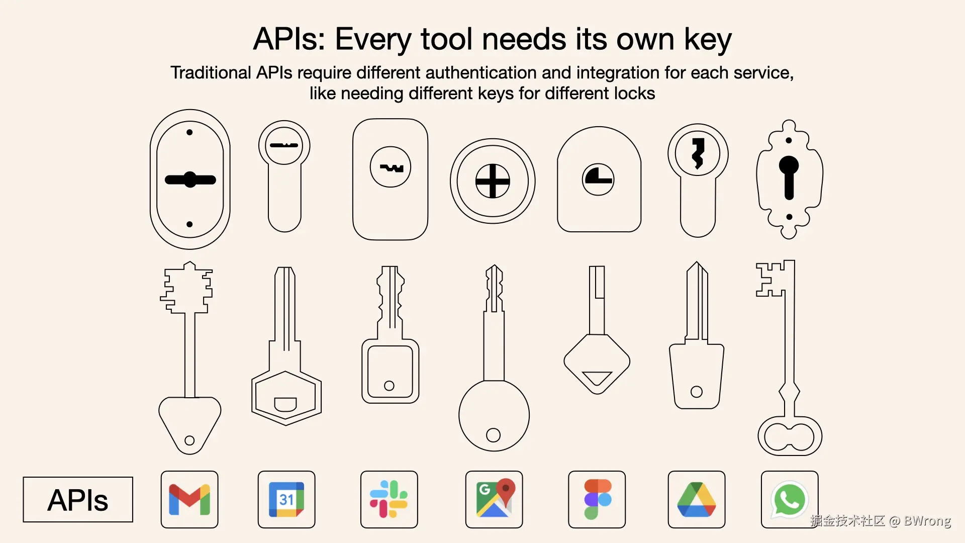 - 集成成本高昂:每接入一种新数据源,都需要定制专门的集成方案。传统上,将 AI 系统连接到外部工具涉及集成多个 API。每个 API 集成都意味着单独的代码、文档、身份验证方法、错误处理和维护。