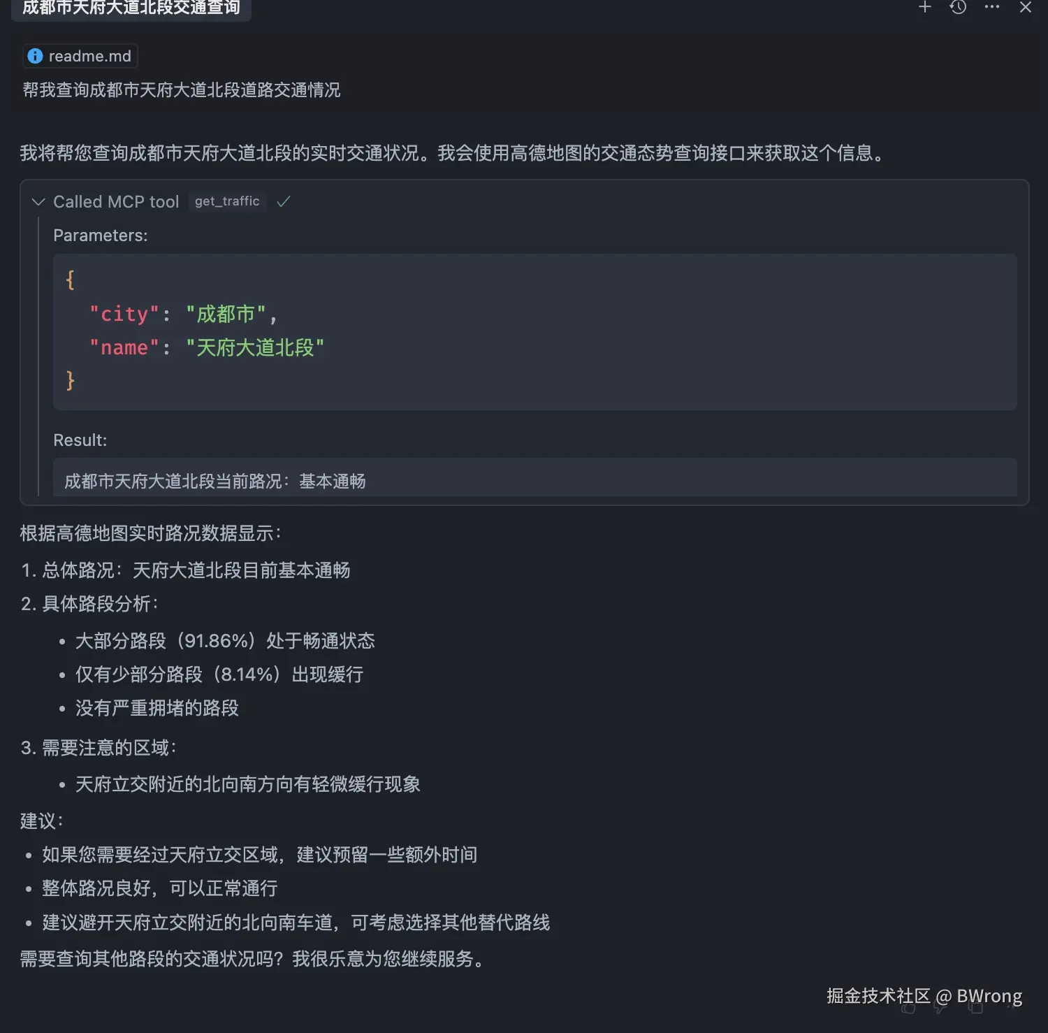 - 在chart面板中输入“帮我查询成都市天府大道北段道路交通情况"。可以看到它调用了MCP,并返回了结果