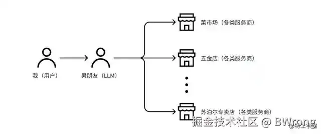 但是,男朋友(LLM)每去一个新地方,都要造一条新路(编写代码),似乎不太方便。于是后来字节扣子、百度千帆、阿里云百炼等平台出现了,他们就好比是开了一个商超。商超跟各种小店说,我这里人气旺,你们直接按我们的要求来货架上架你们的商品就行,再跟我(User)说我这现成的商品多,以后让男朋友(LLM)来这买就行。