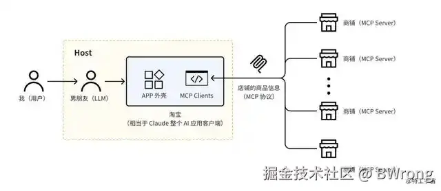 此外,Anthropic 基于这个电商平台(Client)的理念做了一个淘宝的外壳,这个淘宝就好比没有包含 LLM 的 Claude Desktop。在这基础上,如果再加上 Claude 的模型,就相当于让“男朋友刷淘宝”,这一整体就构成了 MCP Host。