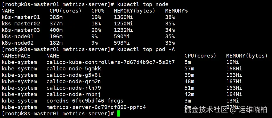 - Master01节点查看node、pod资源使用率