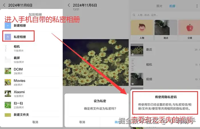 步骤:在手机相册界面查找类似【私密相册】的文件夹,使用密码进入其中,找到你需要的视频,将其恢复正常显示。