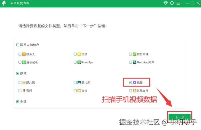 步骤1: 连接手机,启动扫描。打开软件,选择适合你的方法,将手机连接到电脑。然后选择【视频】,点击【下一步】,软件就会开始施展它的扫描技术。