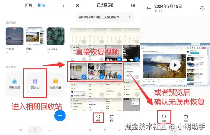 步骤:打开相册应用,找到并进入【回收站】,选择你需要的视频,点击【恢复】,或者先预览,确认无误后再进行复原。