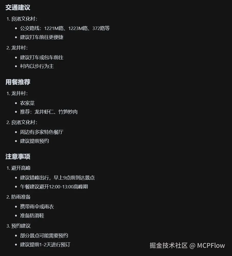 我们可以看到会调用哪些工具来完成我们的要求,查询小众景点,天气状况以及特色景点。