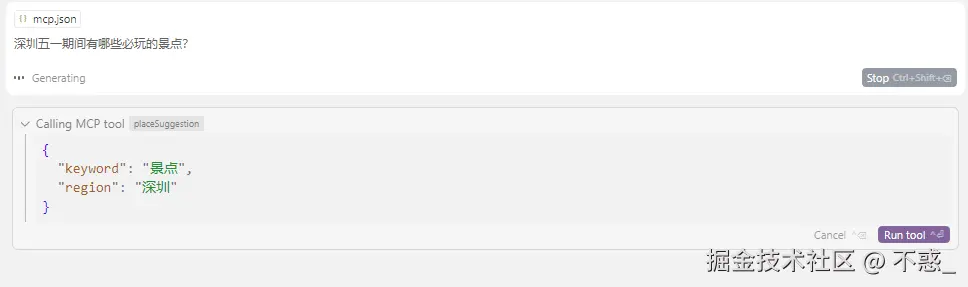 在对话界面,在输入框下方工具中,点击“@”符合,选配置的mcp.json。